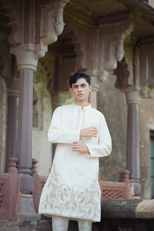 Ivory Floral Zardozi Embroidered Silk Kurta Paired with Matching Pajama