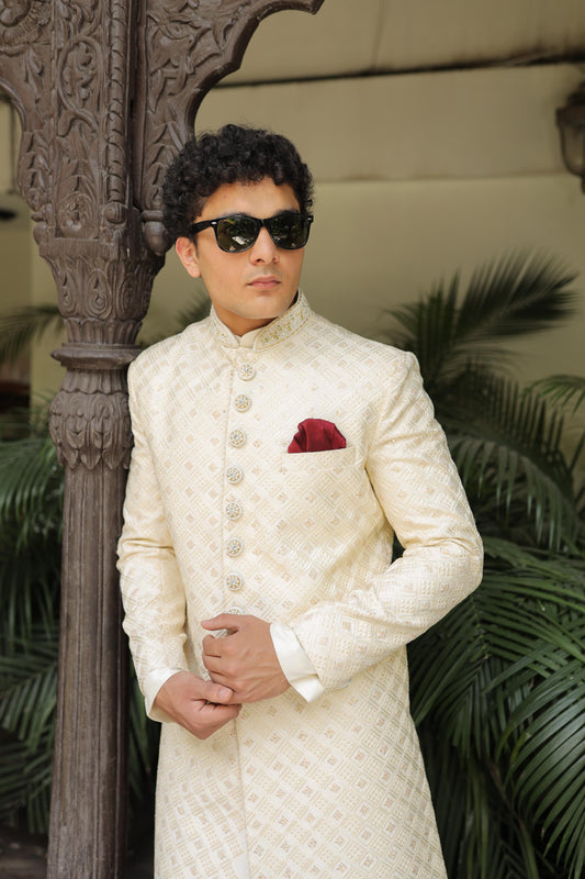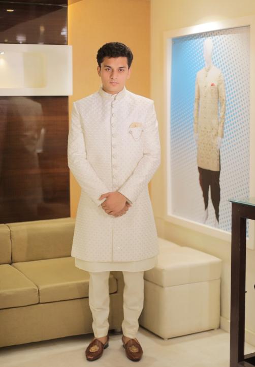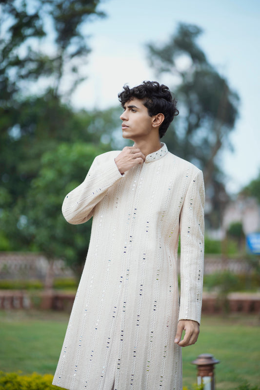 Ivory Embellished Sequins Sherwani Set paired with Kurta and Pajama