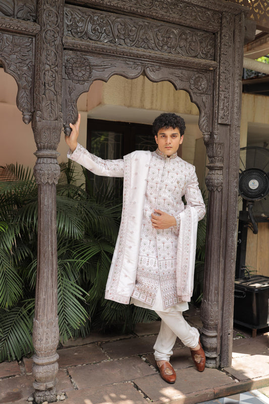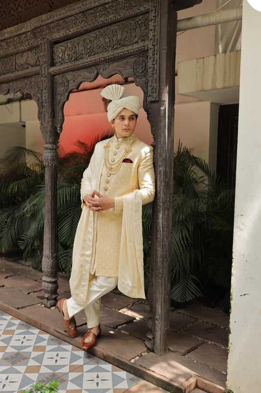 Champagne Sherwani Ensemble with Intricate Dupatta Detailing and Matching Kurta Pants
