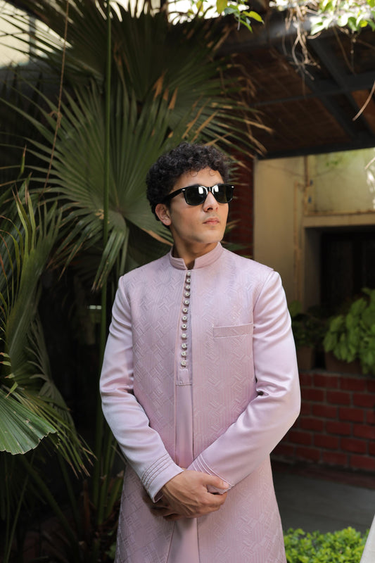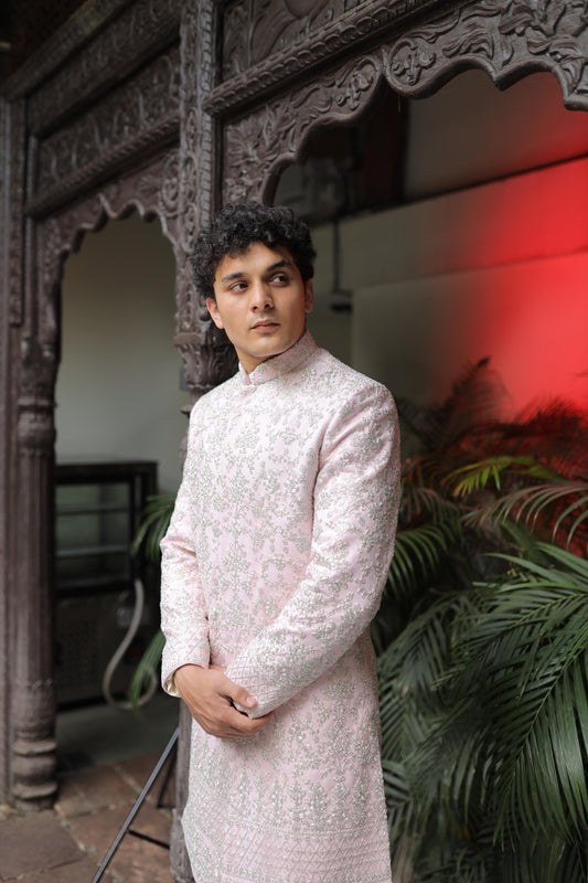 Rose Gold Sherwani with Mirror, Pearl, and Sequin Embellishments