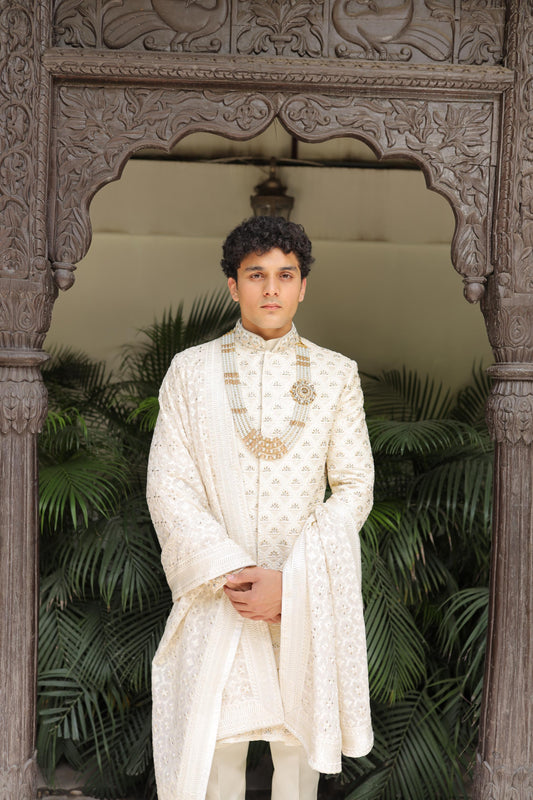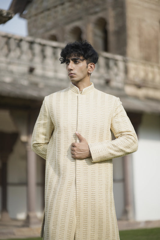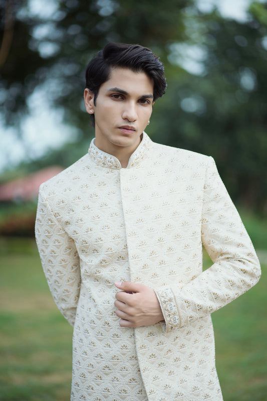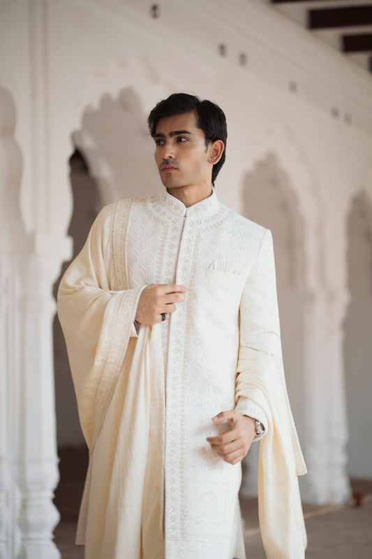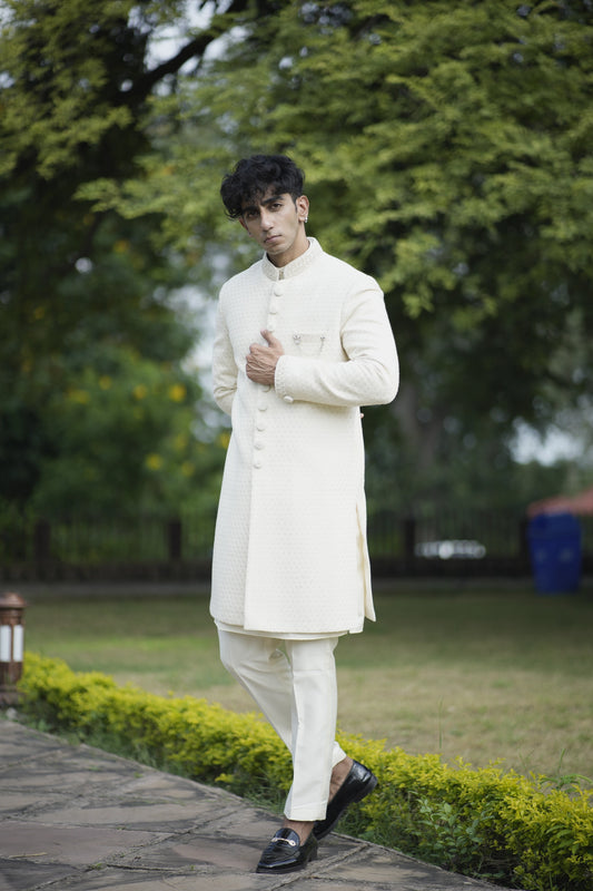 Ivory Chikankari Sherwani with Zardozi and Zari Work, Paired with Kurta and Straight Pants